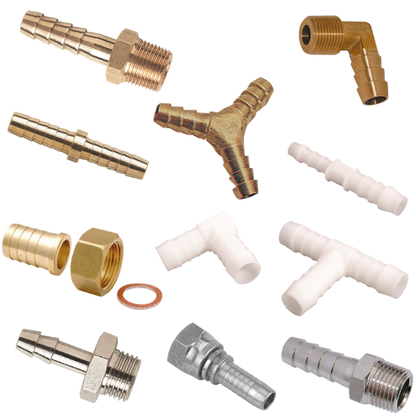 Hose tails and threaded connectors are generally available in thread sizes from 1/8” up to 2”, with hose tails to suit a wide range of hose bore sizes from small pneumatic tubing through to larger water, fuel and suction hose.